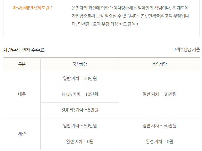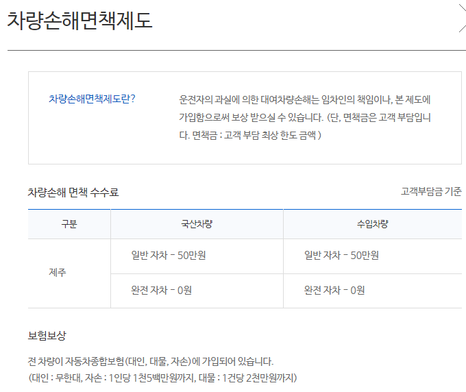 운전자의 과실에 의한 대여차량손해는 임차인의 책임이나, 본 제도에 가입함으로써 보상 받으실 수 있습니다. (단, 면책금은 고객 부담입니다. 면책금 : 고객 부담 최상 한도 금액 )
