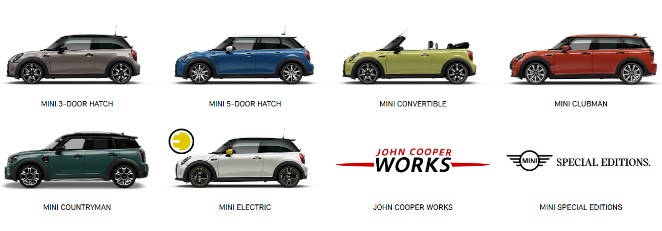 미니 해치백 (3도어, 5도어), 미니 컨버터블, 미니 클럽맨, 미니 컨트리맨, 미니 일렉트릭 6가지 종류가 있습니다. 아래에서 가격을 확인해보세요.