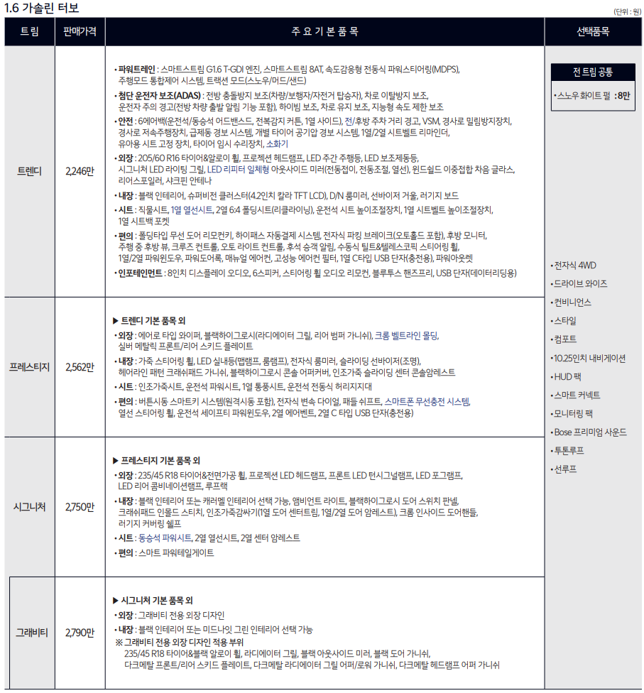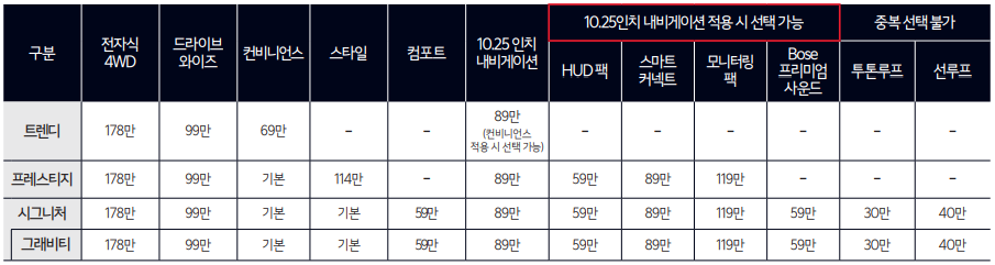 편의 사양을 위해 동급 최초로 차량 정비 보조후방 충돌 방지 보조, HDA 및 OTA를 사용한 10.25인치 내비게이션, 원격 시동 기능이 있는 스마트 키, 전방 이중 접합 방음 유리가 적용됩니다.