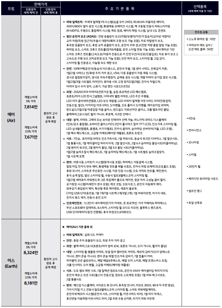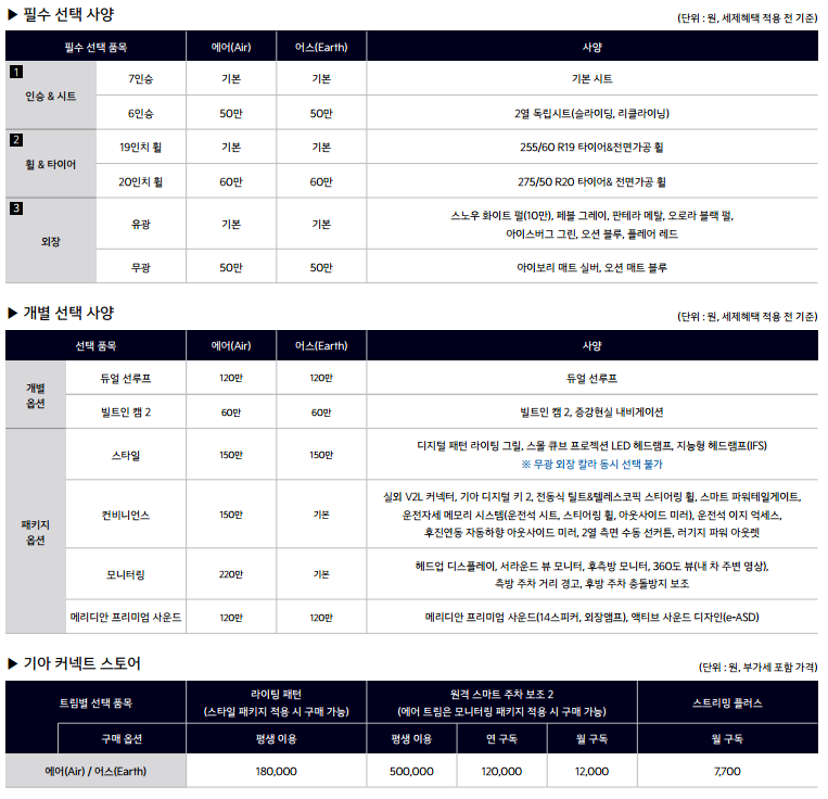 EV9 2WD 가격은 에어 7337만원, 어스 7816만원입니다. 옵션을 추가하면 가격이 상승합니다.