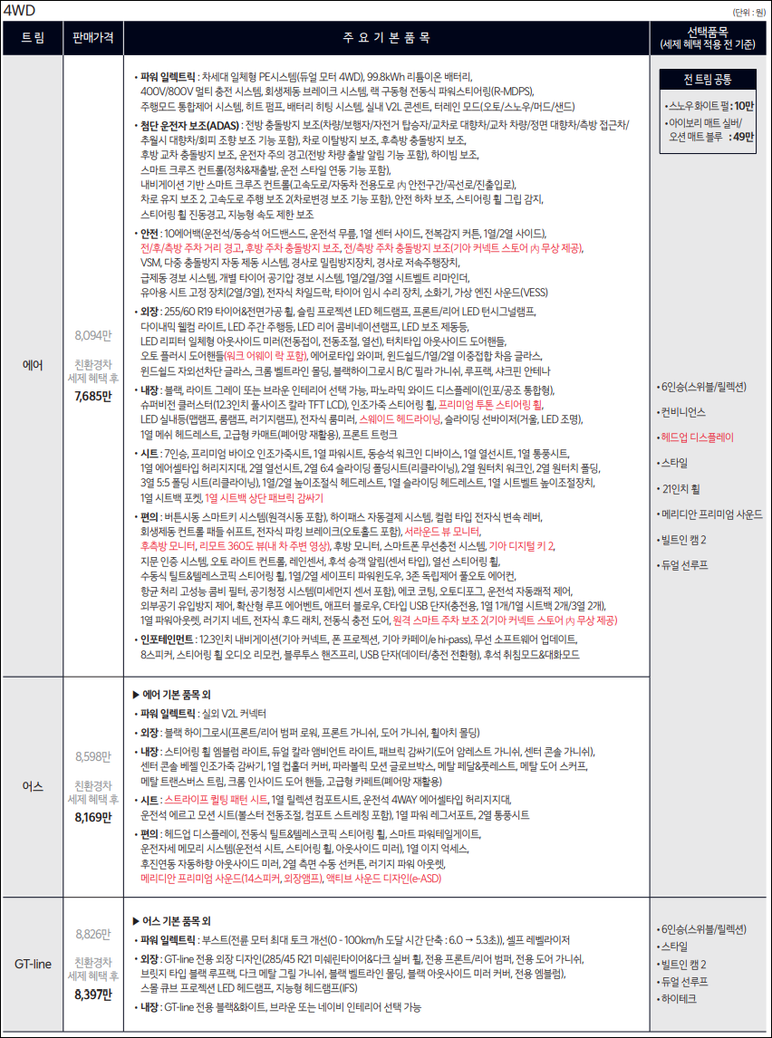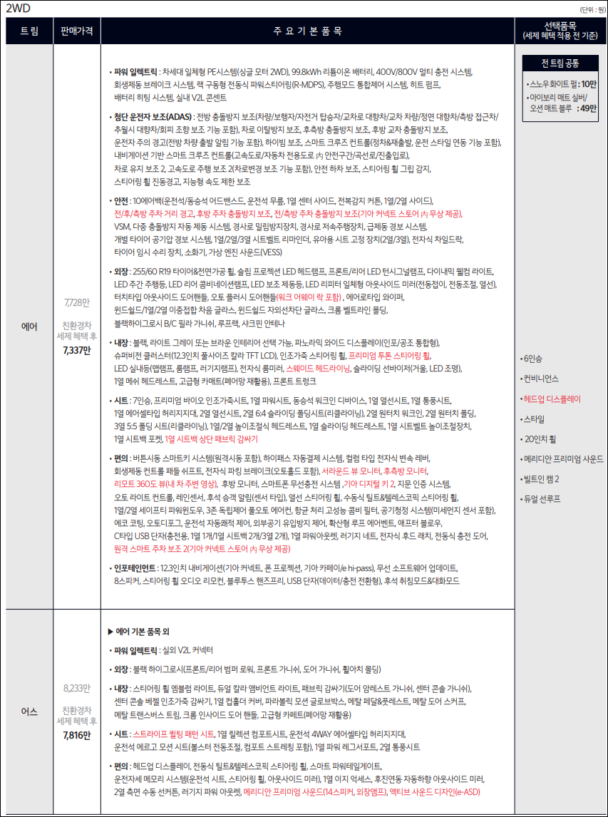 EV9 2륜구동 기준 에어 어떤 옵션이기본으로들어갈까요?