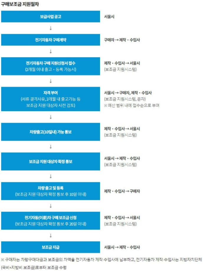 모집공고를 확인 후 전기차 구매 계약을 합니다. 그 후 구매처에서 전기차 지원서를 접수합니다. 자격이 맞는지 확인 후 결격사유, 2개월 이내 출고 가능한지 등 확인합니다. 결격사항이 없다면 보조금 지원 확정 통보 후 차량을 받으면 되겠습니다.