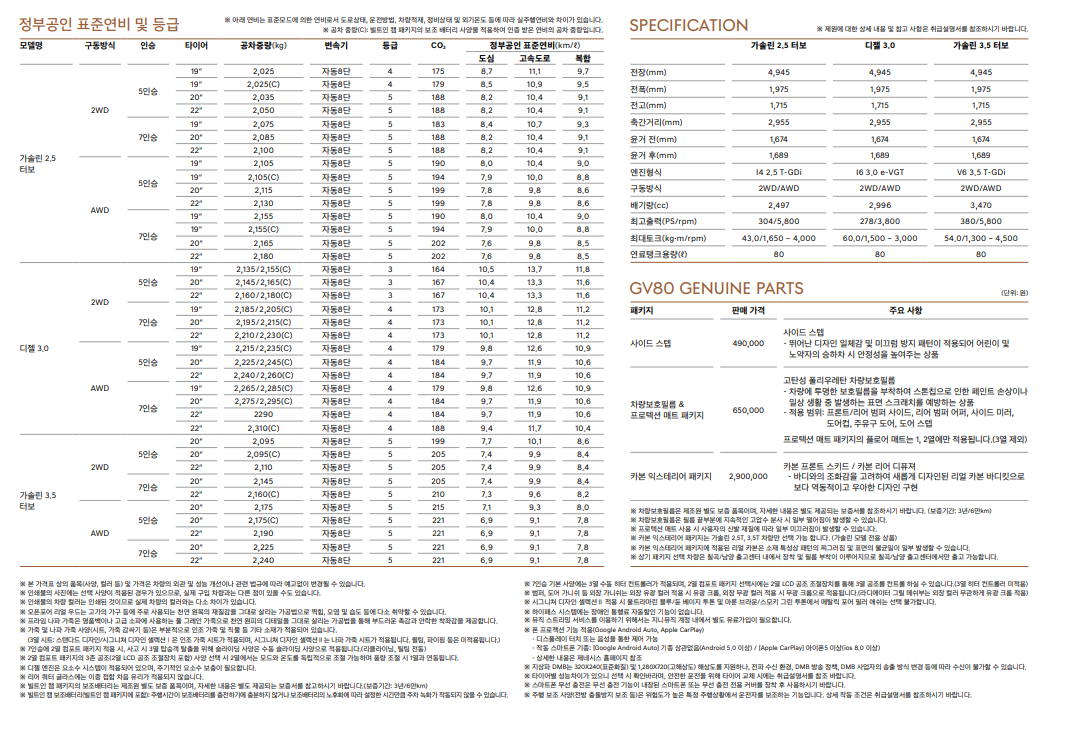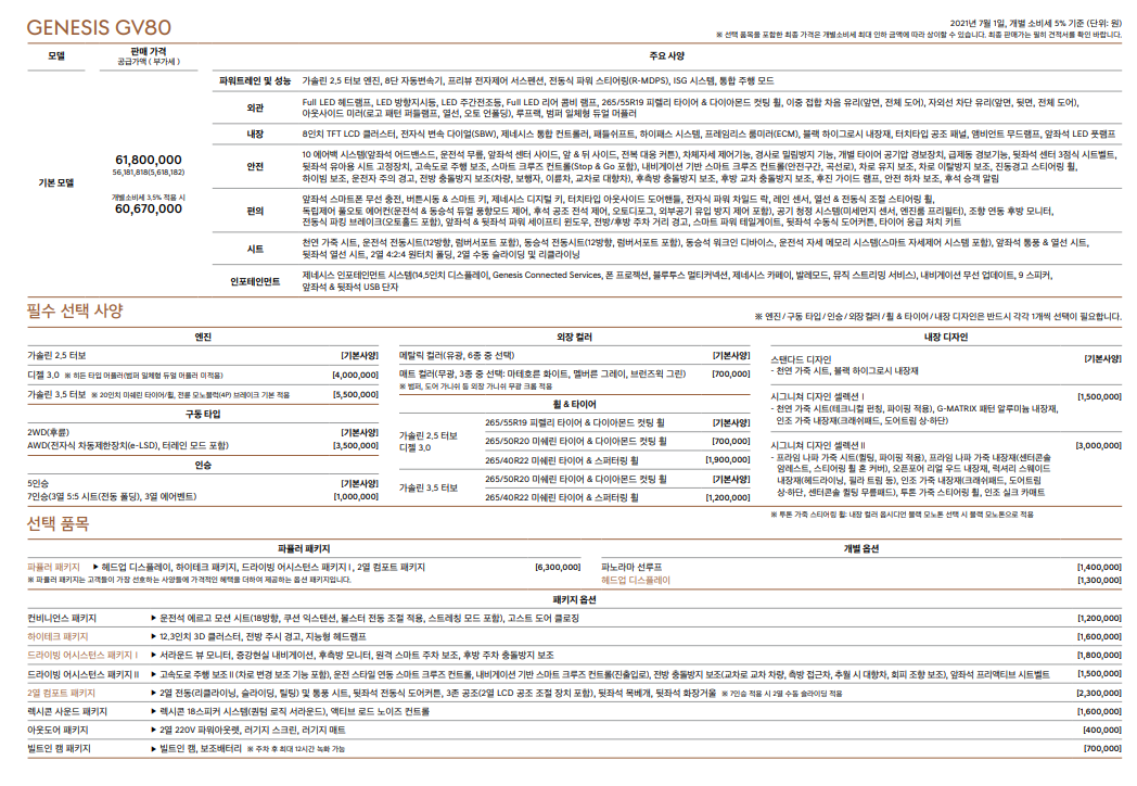 - 출고가는 GV80 출시일에 맞춰 출고되었으며 최저 트림은 6180만원부터, 풀옵션 모델은 3가지 옵션을 모두 사용할 수 있습니다.5T 모델은 9384만원입니다. 하지만 선택 품목으로 빠진 옵션도 꽤 있었지만 생각보다 비싸다는 의견이 많았습니다.
