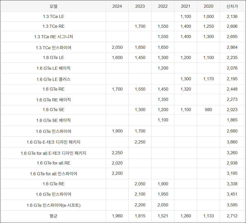 | 모델 | 2024 | 2023 | 2022 | 2021 | 2020 | 신차가 |