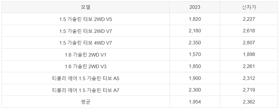 2023년부터 현재까지 출시중인 더 뉴 티볼리 중고차 가격은 2023년식 1954만원입니다.