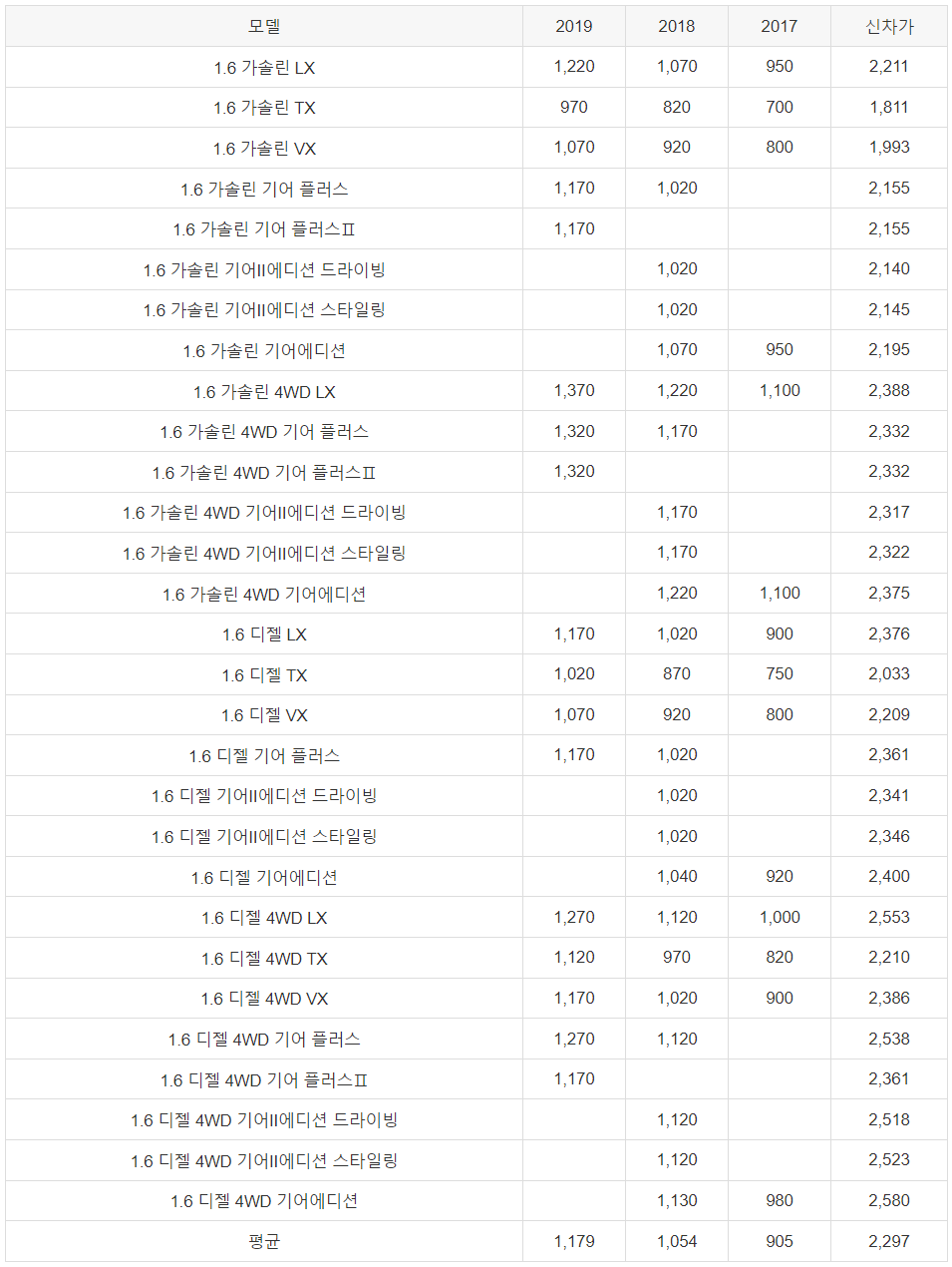 1.6 디젤 4WD LX | 1,270 | 1,120 | 1,000 | 2,553 |