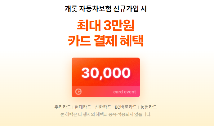 캐롯퍼마일에서는 신규 가입시 최대 3만원의 카드 혜택이 있습니다. 국민카드 3만원, 신한카드 3만원 혜택입니다. 아래 사진을 클릭해서 이벤트페이지에 접속해보시기 바랍니다.