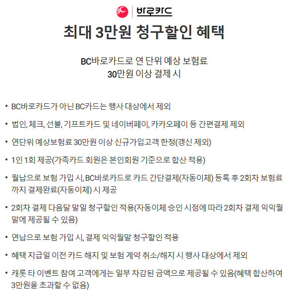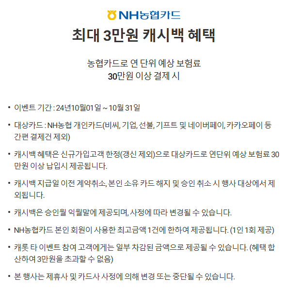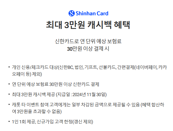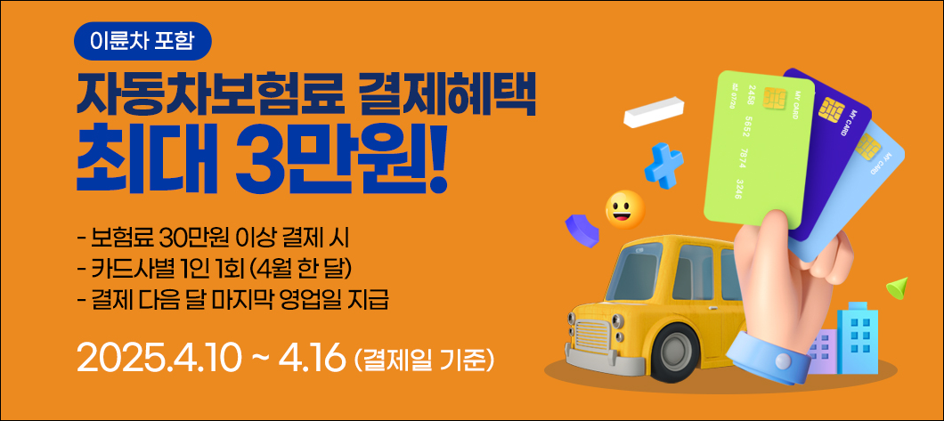 - 하나, 농협, 신한 카드로 자동차보험에 신규 가입할 경우 3만원 캐시백을 지급합니다.