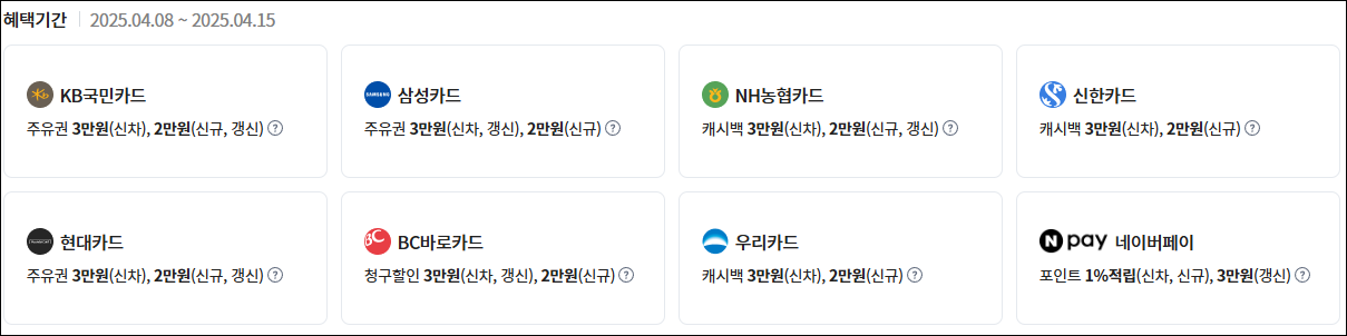 - 삼성카드, KB국민카드, 현대카드, 신한카드에서 신규로 가입할 경우 3만원 주유권 지급