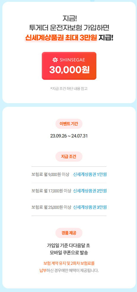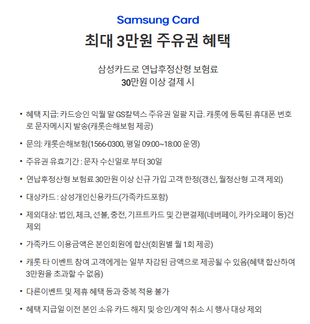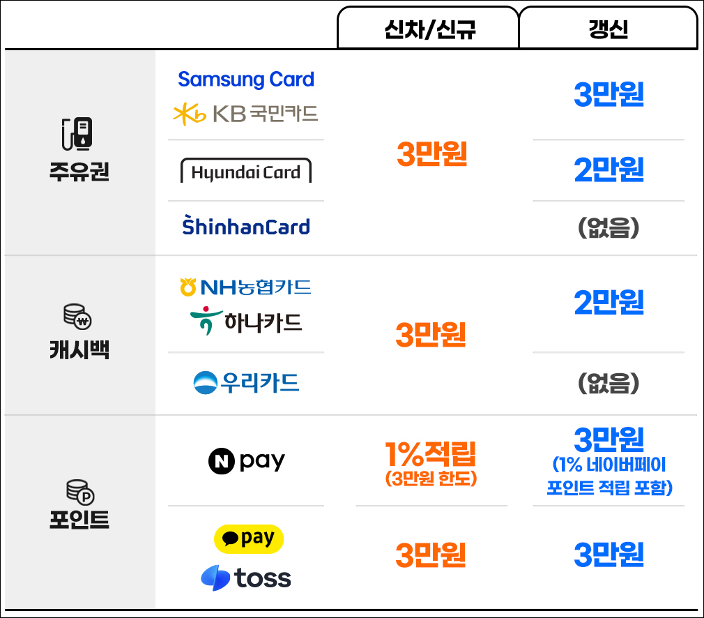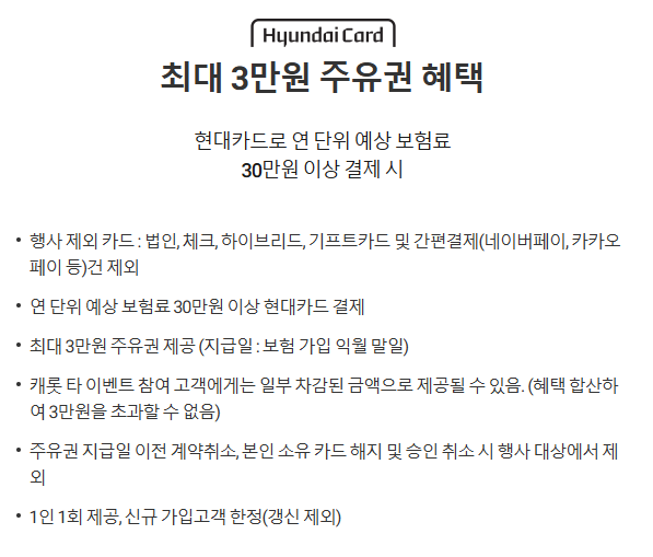 - 갱신할경우 삼성, KB국민카드 3만원, 현대카드 2만원 주유권 지급