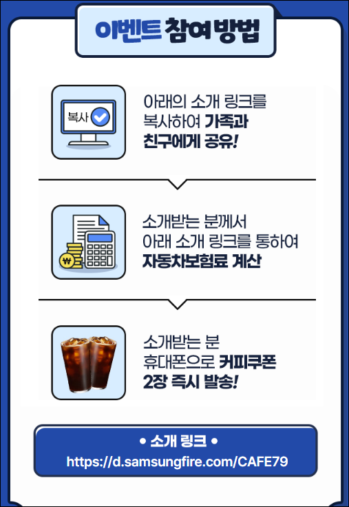 현재 친구에게 공유한 링크로 삼성화재 다이렉트 자동차보험의 자동차보험료만 계산해봐도 스타벅스 커피 2잔을 지급하는 이벤트를 진행하고 있으니 관심있으시다면 이 링크에서 확인해보시기 바랍니다.