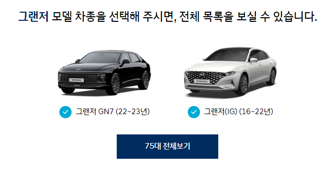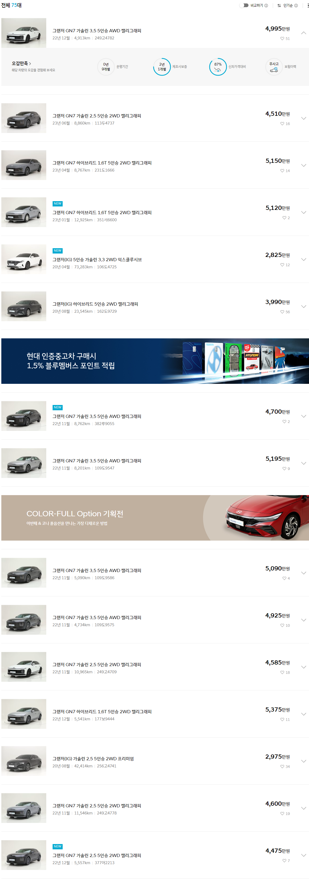 현재 그랜저 차량은 75대가 있습니다. 키로수가 적고, 옵션이 많이들어간 차량일수록 차량 가격이 비싼걸 볼수가 있습니다.