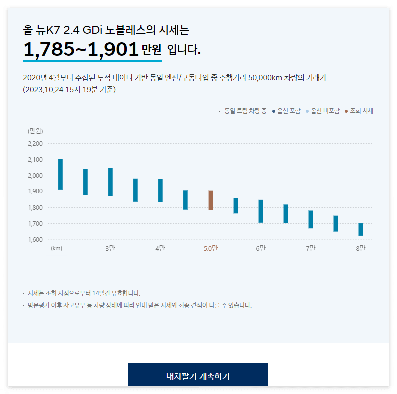 입력한 차량의 중고차 연식별 시세를 확인할 수 있었습니다. 5만키로 정도 탄 k7의 경우 1785만원부터 1901만원사이의 중고차 시세를 형성하고 있습니다.