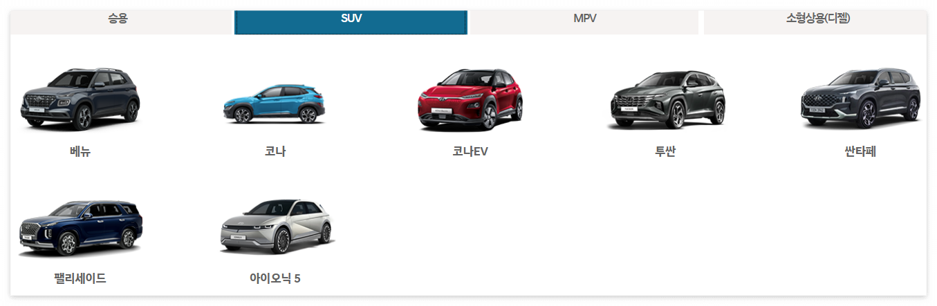 SUV 대상차량은 베뉴,코나, 코나EV, 투싼, 싼타페, 팰리세이드, 아이오닉5 입니다.