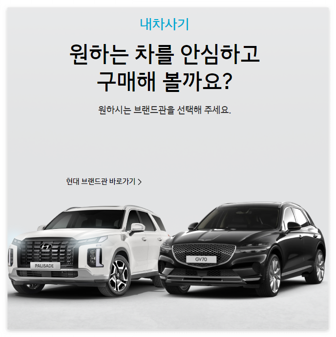 왼쪽의 내차 사기에서 현대 브랜드관과 제네시스 브랜드관으로 나뉘어져있습니다. 원하는 브랜드를 클릭해봅니다. 사진을 클릭해도 홈페이지로 접속됩니다.
