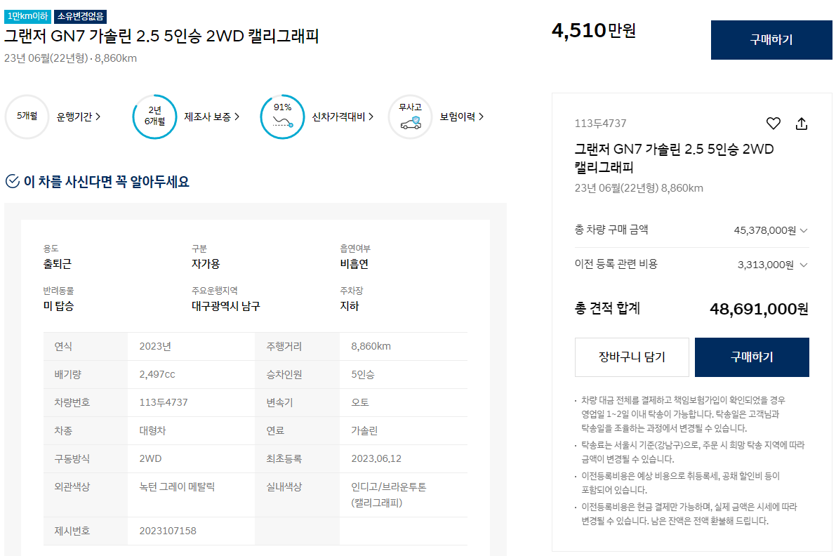 이중에서 4510만원 그랜저 GN7 캘리그래피 트림 중고차를 확인해보겠습니다. 연식은 2023년식, 주행거리 8860km, 사고가 한건도 없는 무사고 차량이네요.