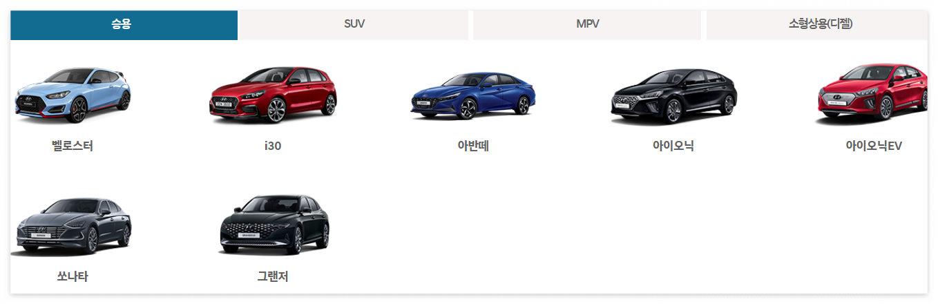 승용차 대상차량은 벨로스터, I30, 아반떼, 아이오닉, 아이오닉EV, 쏘나타, 그랜저입니다.
