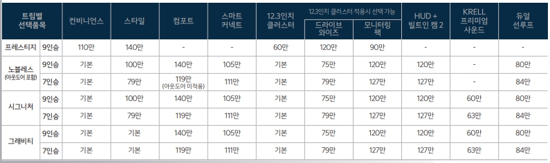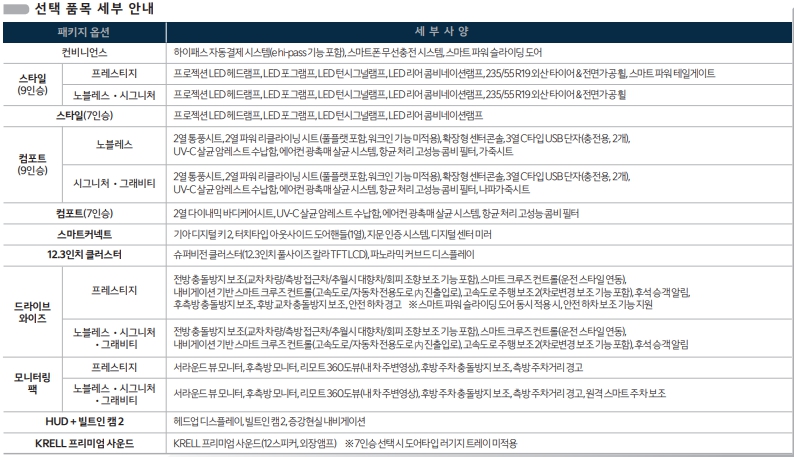 옵션의 경우에는 LED 헤드램프, 슈퍼롱 슬라이드 2열시트, 뒷좌석 11.6인치 디스플레이, 스마트 트렁크, 헤드업 디스플레이, 파노라믹 뷰 모니터, 디지털 리어 뷰 미러, 다이나믹 크루즈 컨트롤 등의 웬만한 옵션이 다 들어가있는것을 확인할수가 있었습니다.