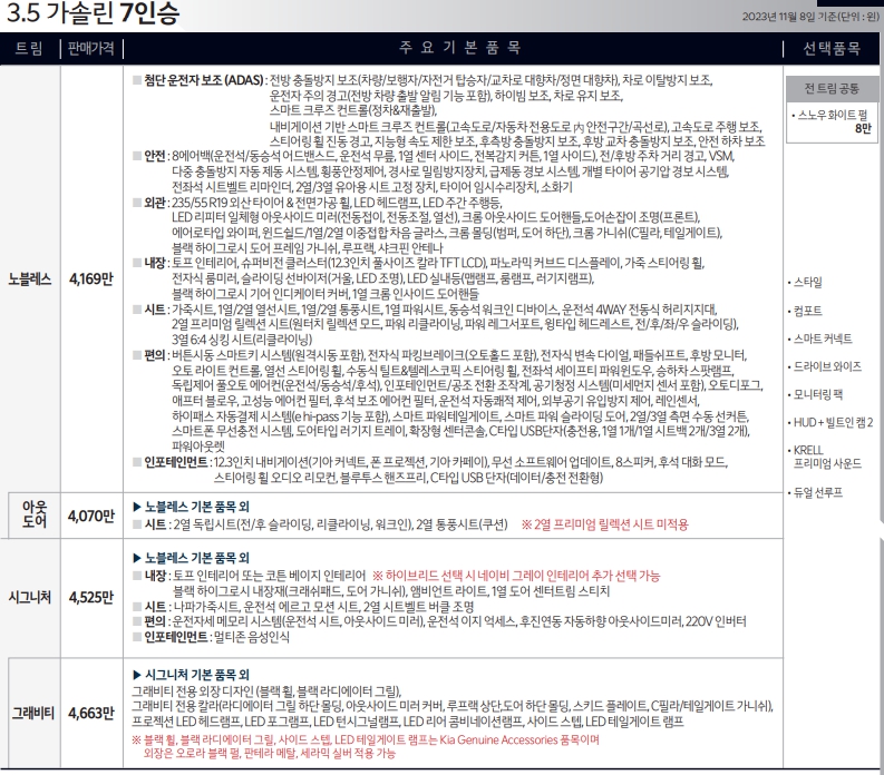 카니발 7인승 3.5 가솔린 가격은 노블레스 4,169만원, 노블레스 아웃도어 4,070만원, 시그니처 4,525만원, 시그니처 그래비티 4,663만원입니다. 옵션을 추가하면 가격이 상승하게 됩니다.