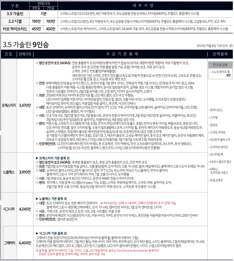 카니발 하이브리드도 기본 모델에서 대략 300만원 오른다고 가정해본다면, 9인승과 11인승 기준으로 대략 3600만원대, 7인승 하이브리드의 경우 대략 4300만원 정도대로 시작할 것으로 조심스럽게 예상해보겠습니다.