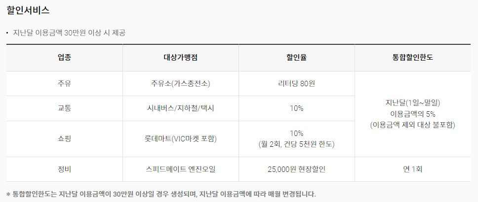 - 롯데마트 10% 할인 - 대중교통 10% 할인 - 차량정비 2.5만원 할인 |