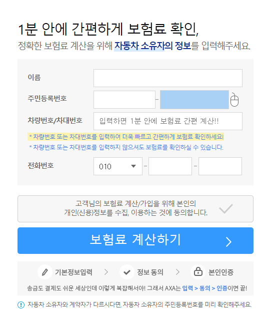 먼저 AXA 다이렉트 자동차보험 홈페이지에 들어갑니다. 접속 후 자동차 보험료 알아보기를 진행합니다.