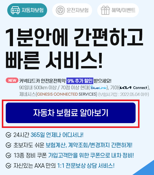 AXA 다이렉트 자동차보험의 경우 커넥티드카 안전운전 특약으로 9% 추가 할인을 진행하고 있습니다. 22년 5월 4일 이후에 해당하기 때문에 만약 현재 자동차보험 가입을 고려하고 계신다면 해당 조건에 부합하는지 확인해보시고 할인혜택도 받아가시기 바랍니다.
