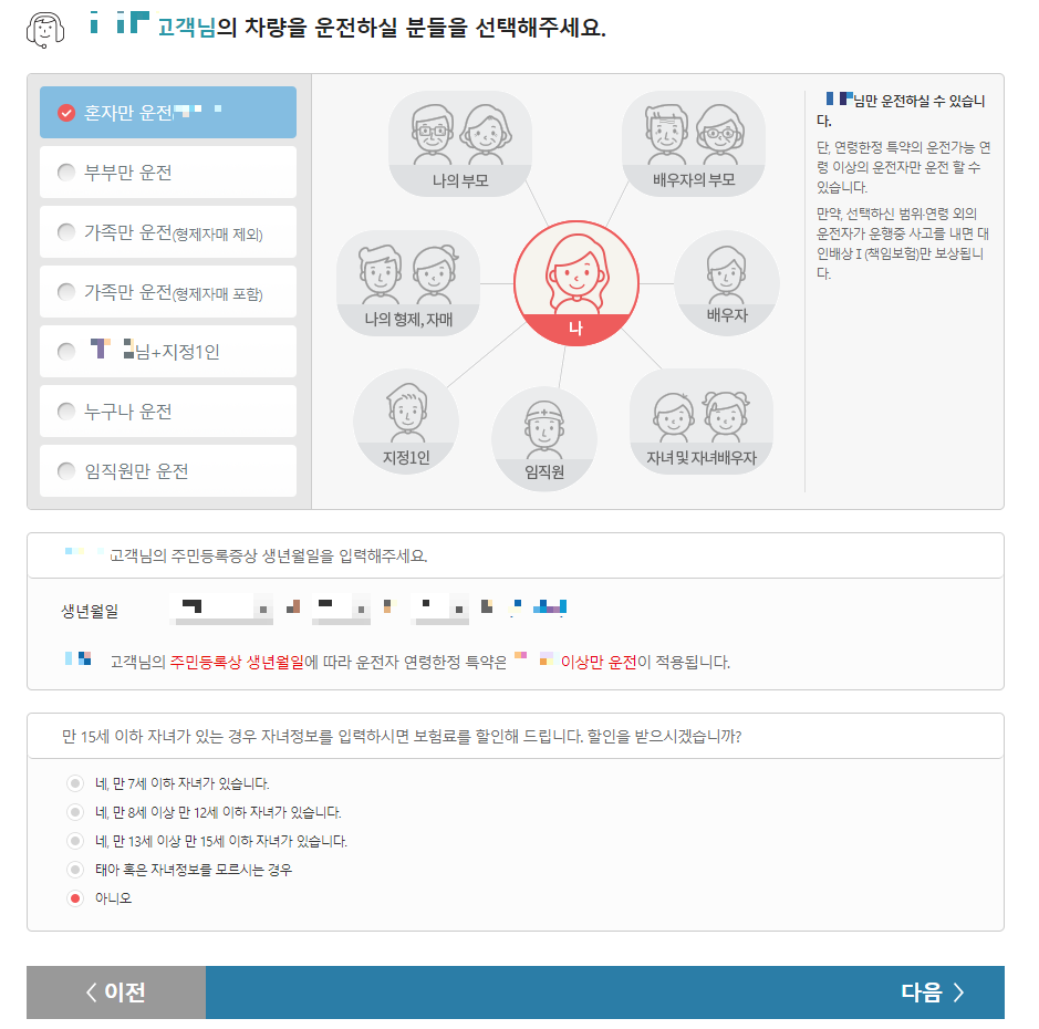 다음은 차량 운전자를 추가해야 합니다. 혼자만 운전하는 경우, 부부가 운전하는 경우, 누구나 운전하는 경우 등 나에게 맞는 운전자를 추가해주시기 바랍니다. 자녀가 있는 경우에도 보험료 할인이 적용되기 때문제 자녀가 있는 경우 해당 부분을 선택해주시면 됩니다.