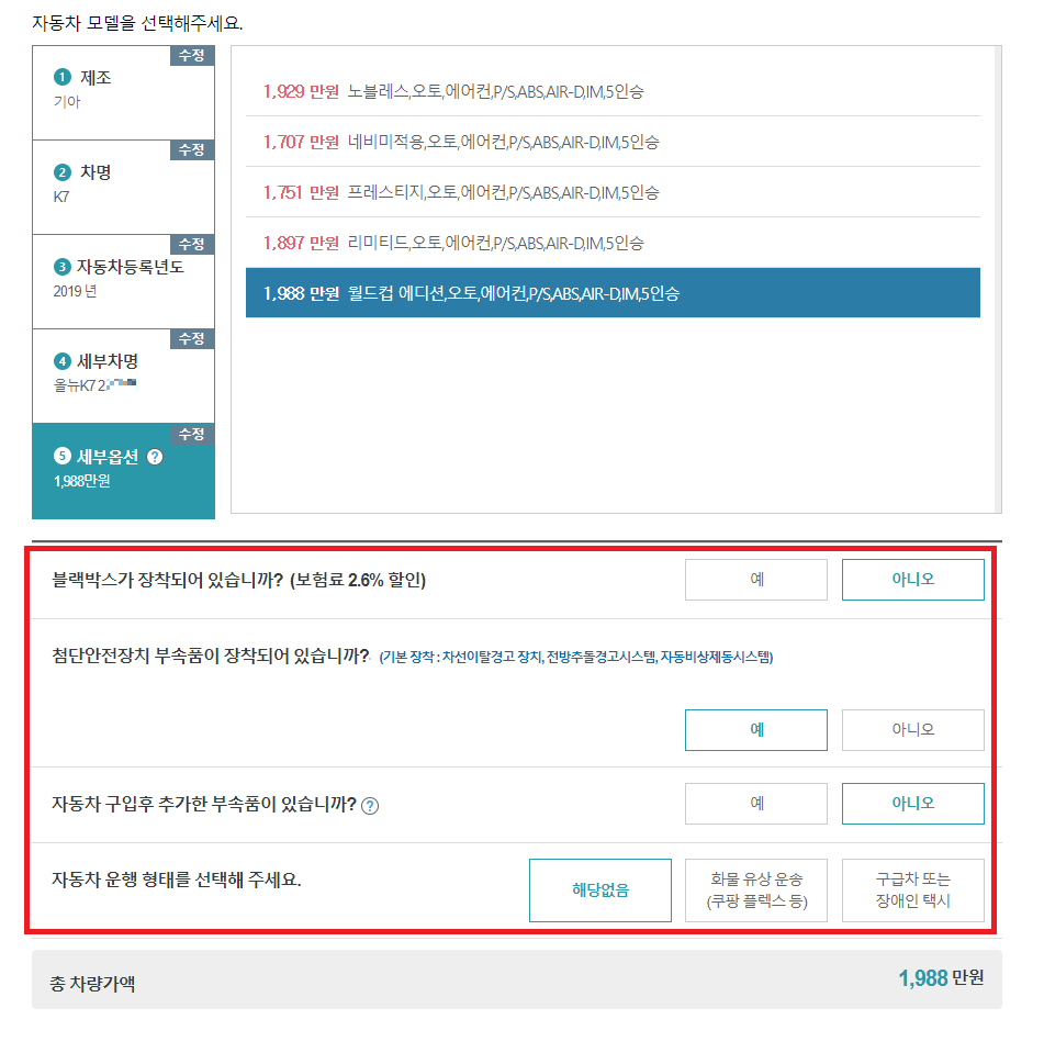 내 자동차 모델에 맞게 선택하시면 차량가액이 산출됩니다. 이후 블랙박스 장착여부, 추가 부속품 장착 여부를 읽어보시고 해당 사항이 있으시다면 체크해주세요.
