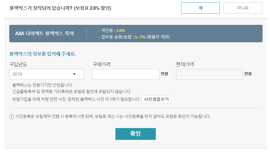 블랙박스가 있다면 보험료 할인이 되기 때문에 장착되어 있는경우 자세한 사항을 꼭 입력해주세요.