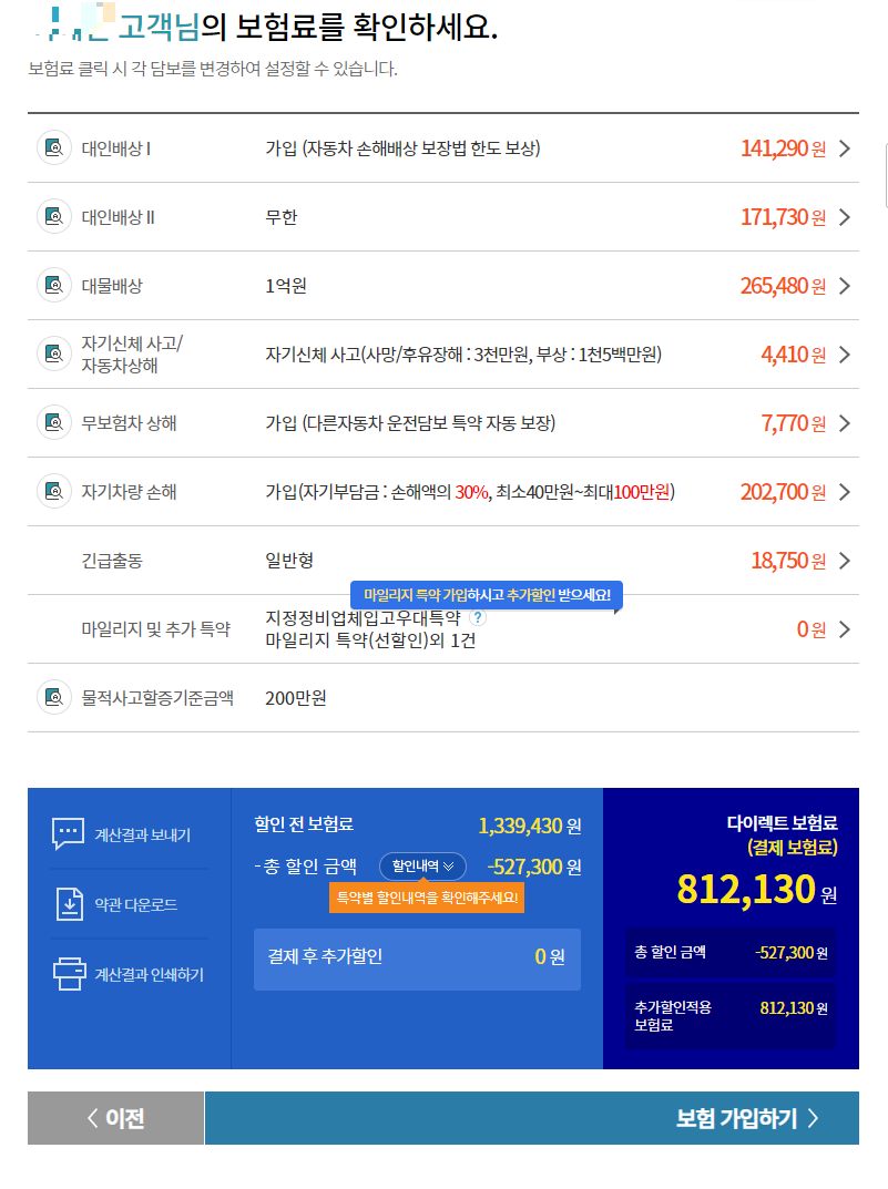 axa 자동차보험 가격은 30대 초반을 남자를 기준으로 812,130원입니다. 자동차보험 가격은 사람 및 차량마다 다르니 본인의 가격은 따로 확인해보시기 바랍니다. 각 특약 별 보장금액에 따라 총 결제 보험료는 상이할 수 있는 점은 참고 부탁드립니다.