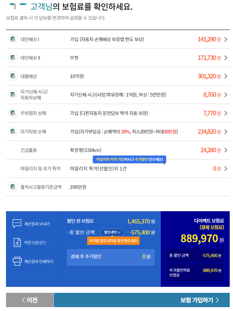 가입 조건이 변경되는 경우 또는 나이 및 차량에 따라 보험료가 달라질 수 있습니다.