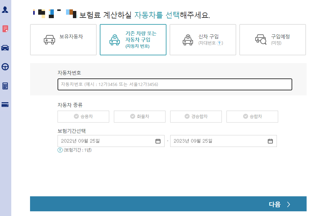 자동차가 있는 경우 내 자동차 정보를 입력해주세요. 만약 신차를 구입하여 차대번호가 있는경우, 구입 예정인 경우에도 선택이 가능하니 자신의 상황에 맞게 선택해주시기 바랍니다.