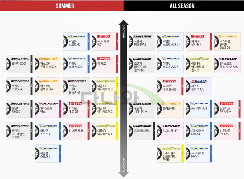 수입타이어 등급표입니다. 여름용과 올시즌을 구분하여 확인해보시기 바랍니다. 눈에띄는 브랜드는 피렐리 타이어, 미쉐린 타이어, 컨티넨탈 타이어 등 이 있습니다.