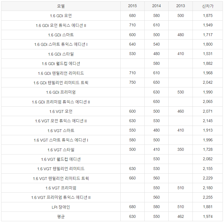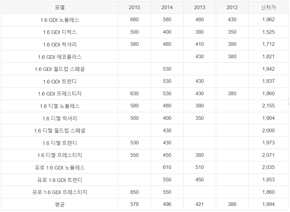 아반떼를 500만원대 이하로 구매하기 위해서는 2015년식 이전의 모델인 더 뉴 아반떼, 아반떼 MD 이전모델을 구매할 수 있습니다. 아반떼 중고차 가격이 궁금하시다면 이 링크를 확인해보시기 바랍니다.