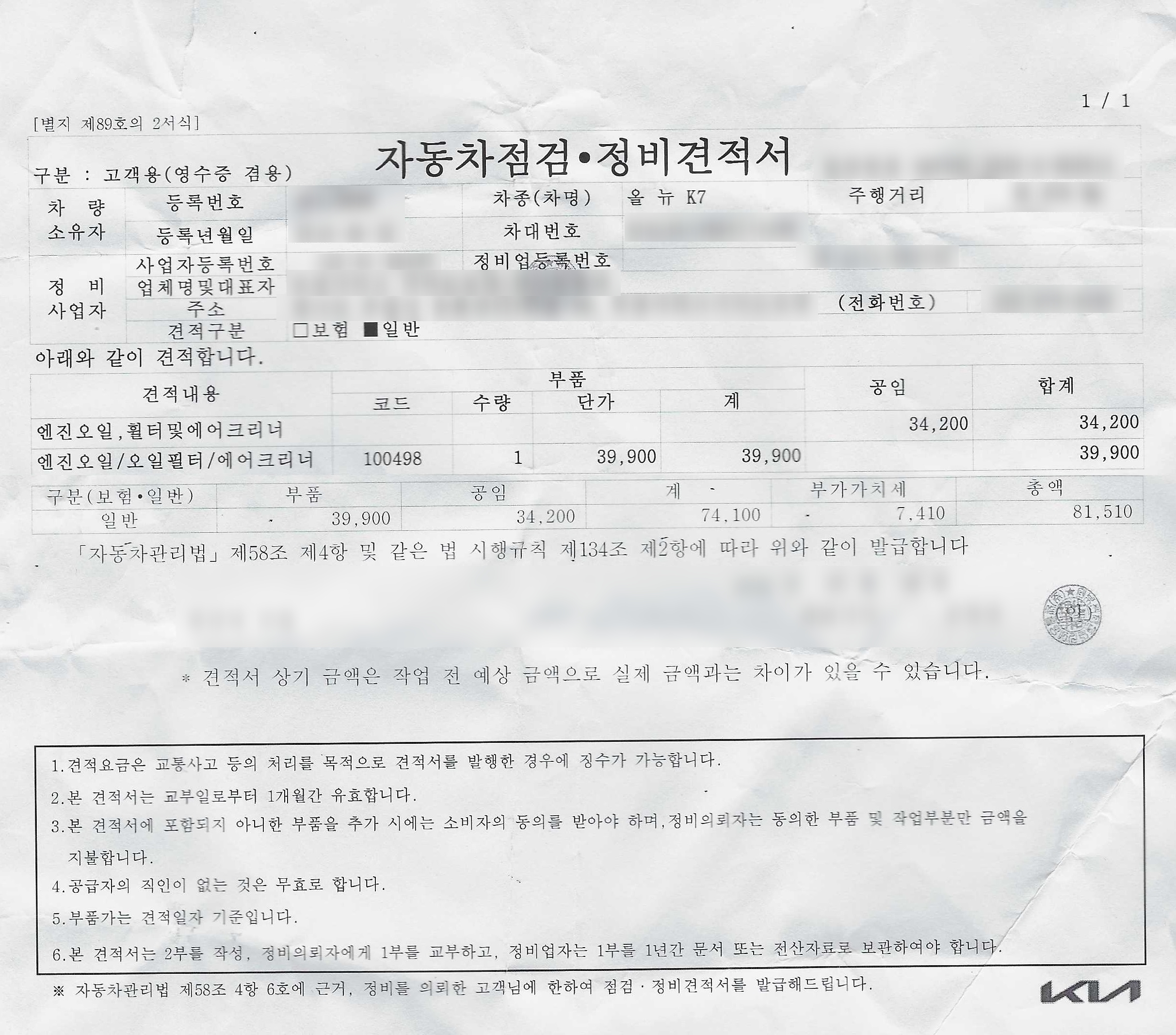 - 1회 : 엔진오일교체(에어크리너, 엔진오일필터포함) 엔진오일과 오일필터를 모두 교환했다면