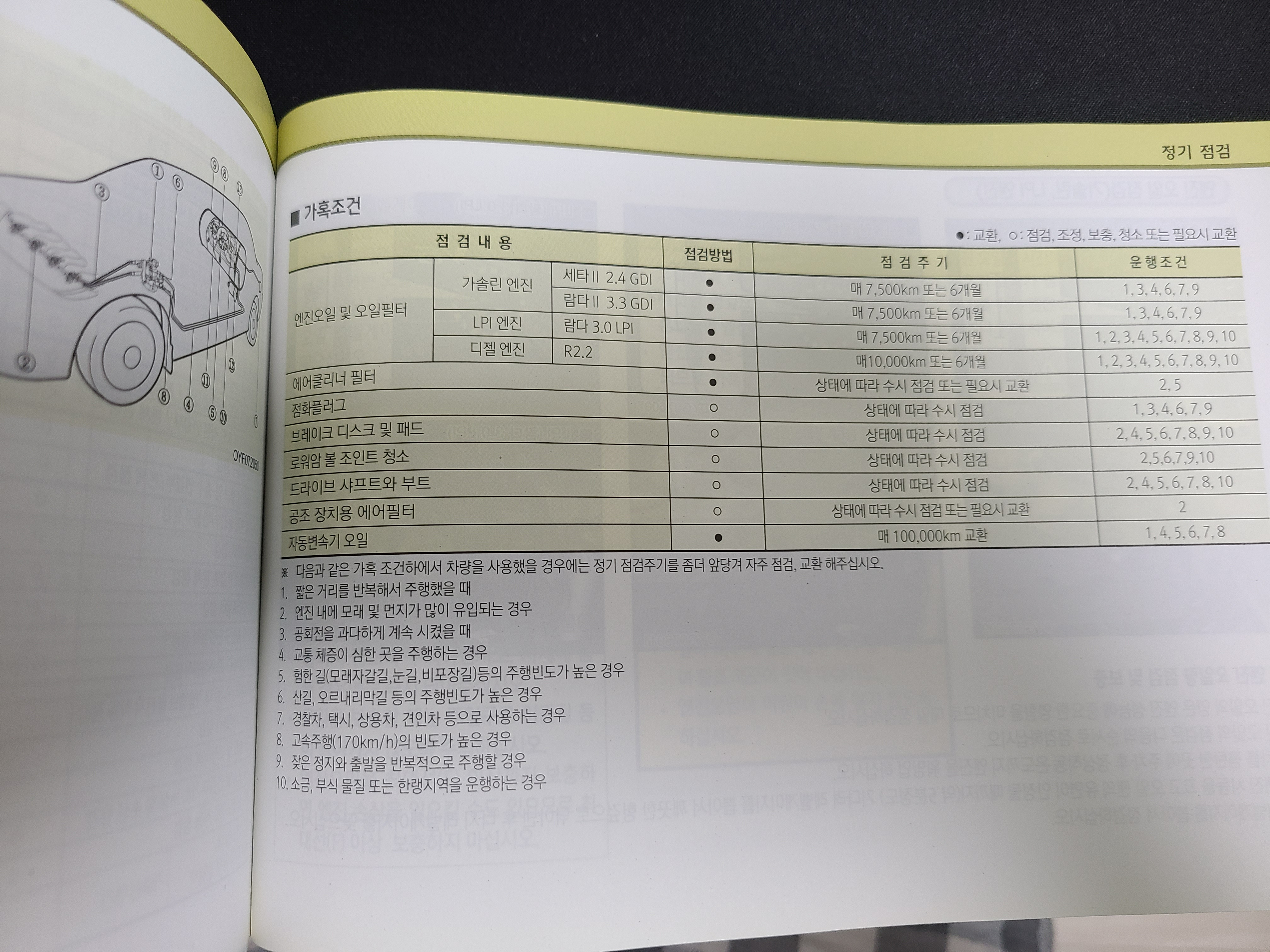 정확한 엔진오일의 교체 주기는 제조사에서 차를 살때 주는 차량 메뉴얼에 보면 내 차의 적당한 엔진오일 교체주기가 명시되어 있습니다. K7의 경우에는 일반적으로는 15,000KM 혹은 12개월마다 교환하라고 되어있지만 가혹조건에서는 7,500km 6개월마다 교체해주라고 되어있네요.