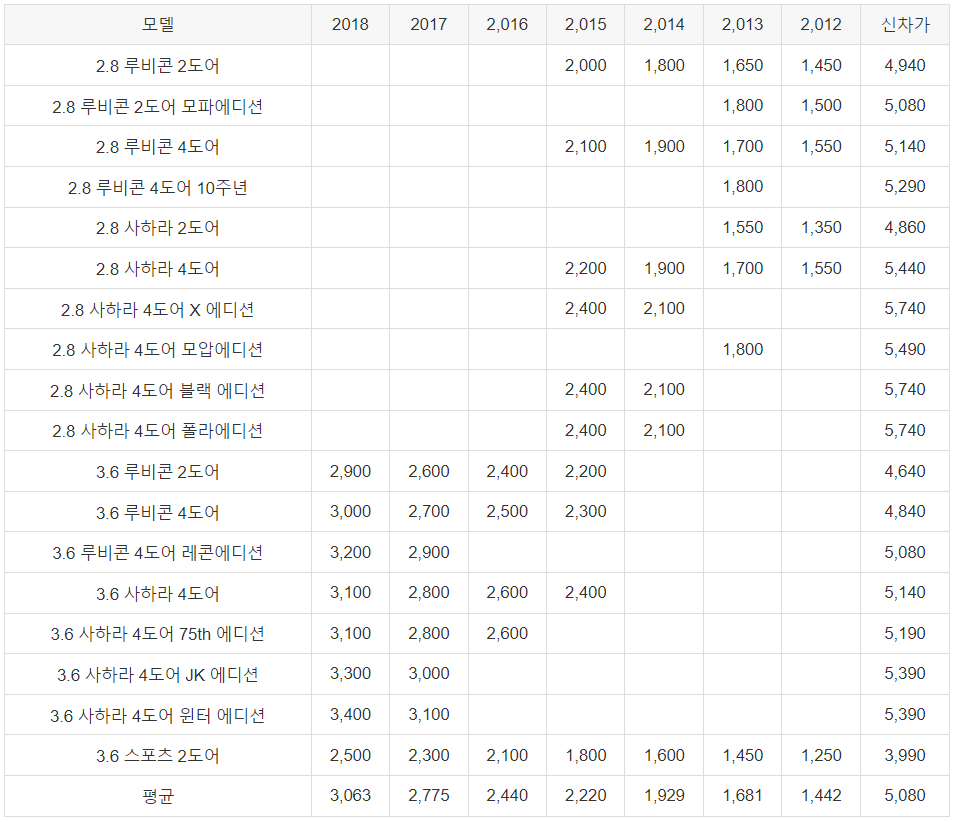 | 2.8 루비콘 2도어 | 2,000 | 1,800 | 1,650 | 1,450 | 4,940 | |||