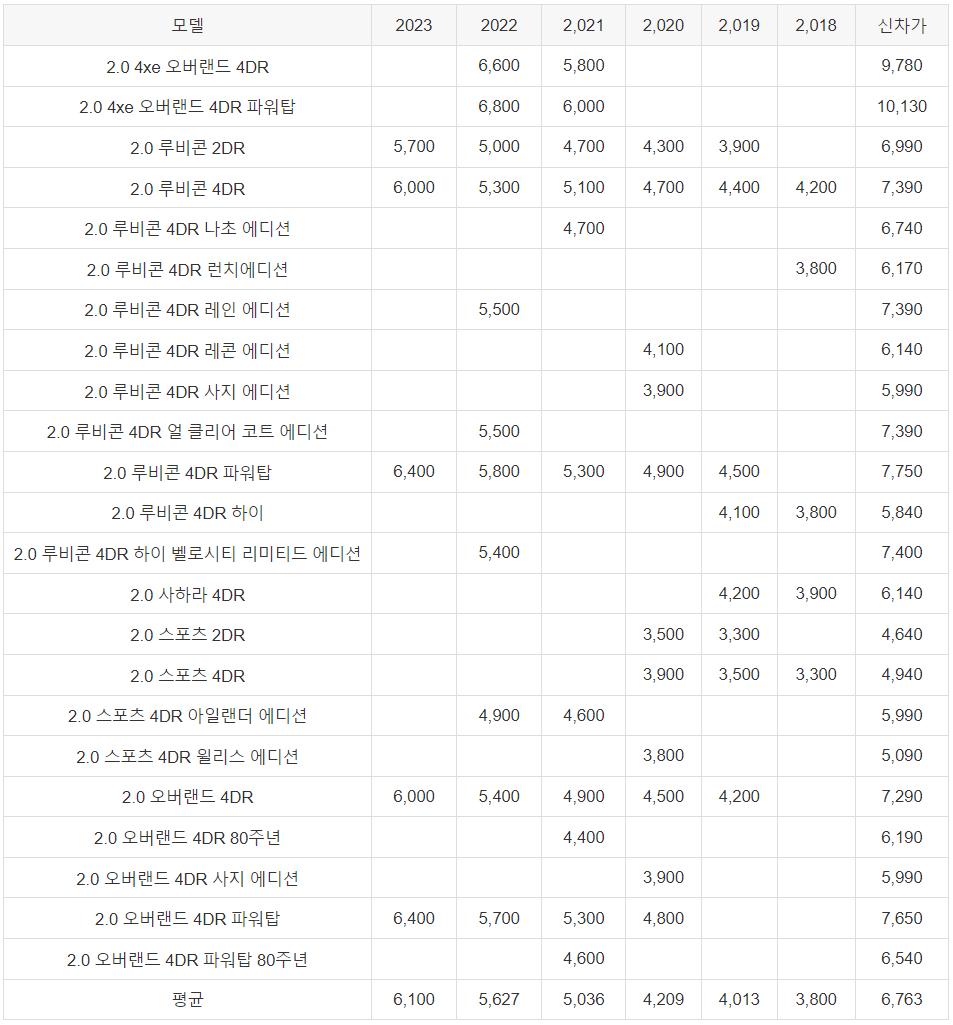 | 2.0 루비콘 2DR | 5,700 | 5,000 | 4,700 | 4,300 | 3,900 | 6,990 | |