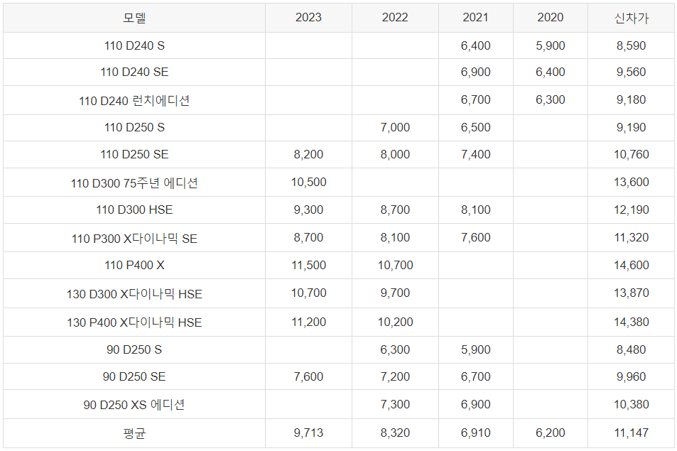 이상으로 랜드로버 디펜더 중고차 가격 시세표 알아보았습니다. 작성일 기준으로 된 중고차 시세표입니다.