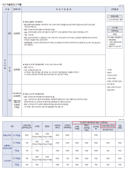 - 5.5㎜ 크기의 확장형 센터 콘솔을 꺼내 서랍처럼 사용할 수 있으며, 수납공간 상부를 테이블로 사용할 수 있습니다. 7인승 시트의 경우 승차감을 높이기 위해 프리미엄 콜렉션 시트를 장착해 엉덩이와 허리에 집중된 하중을 덜어주고 피로를 덜어주며 뒷좌석 공간에 에어컨 필터를 추가해 줍니다.