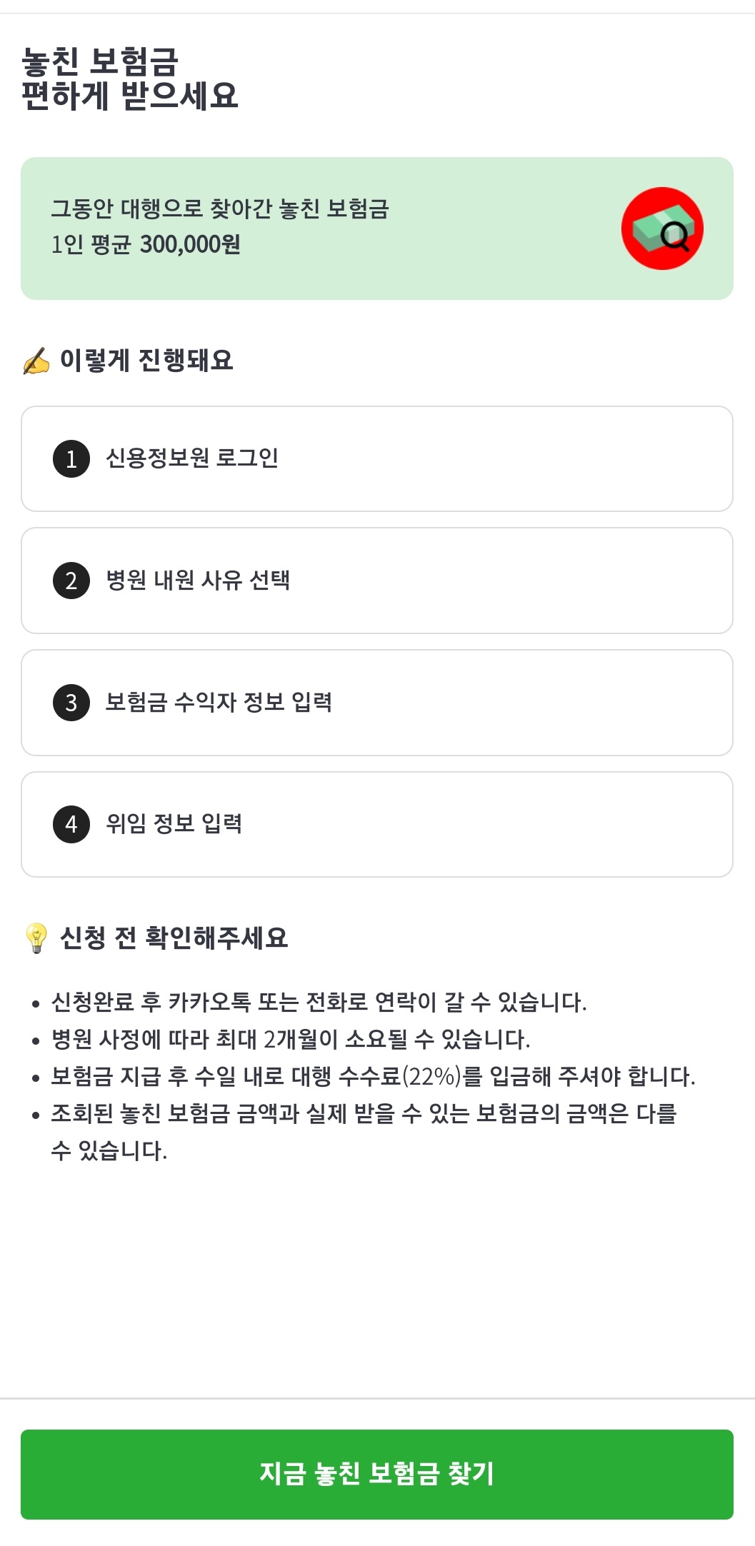 놓친 보험금 조회하기를 클릭하면 라이프캐치에서 대행도 진행해줍니다. 대행으로 하지 않고 확인만하고 본인이 직접 서류를 청구해도 됩니다.