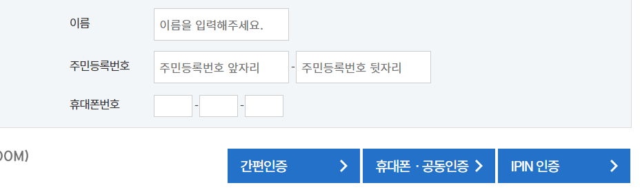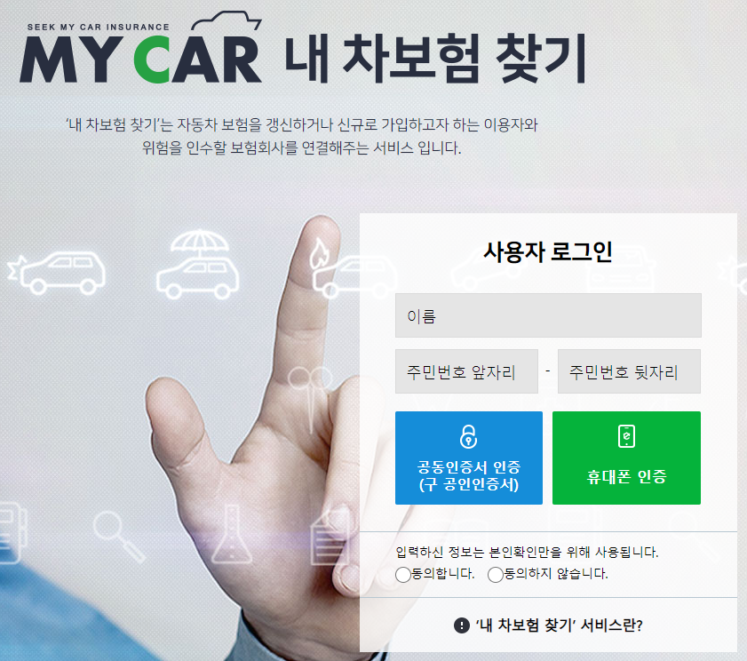 1. 보험개발원의 내 차보험 찾기 홈페이지에 접속하여 이름 및 개인정보를 입력 후 본인인증을 완료해줍니다.