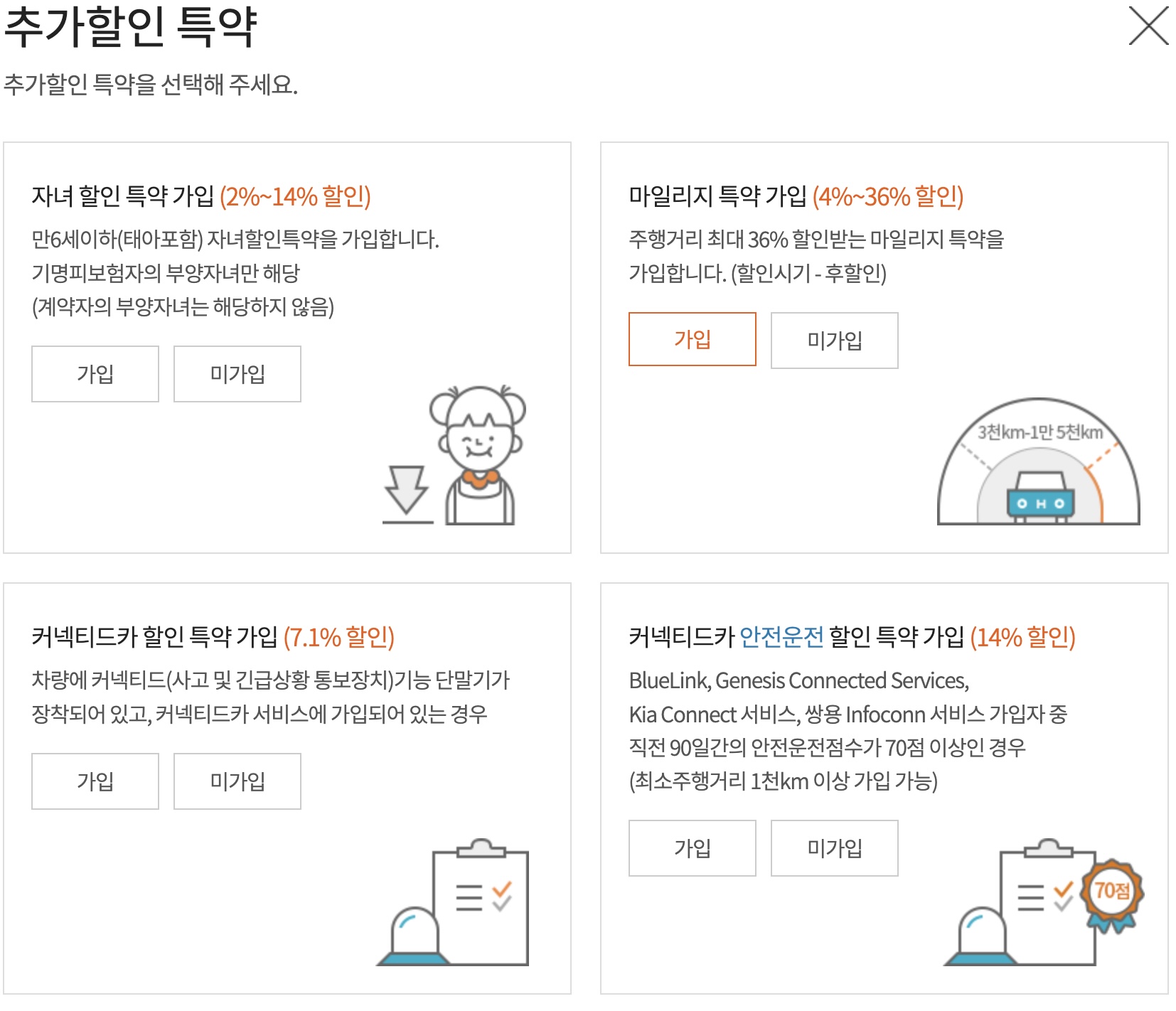 자녀가 있다면 자녀할인, 차량에 블루링크, 유보의 안전운전 점수가 70점 이상일 경우 할인 등 본인의 상황에 맞는 할인을 선택 후 넘어가주도록 합니다.