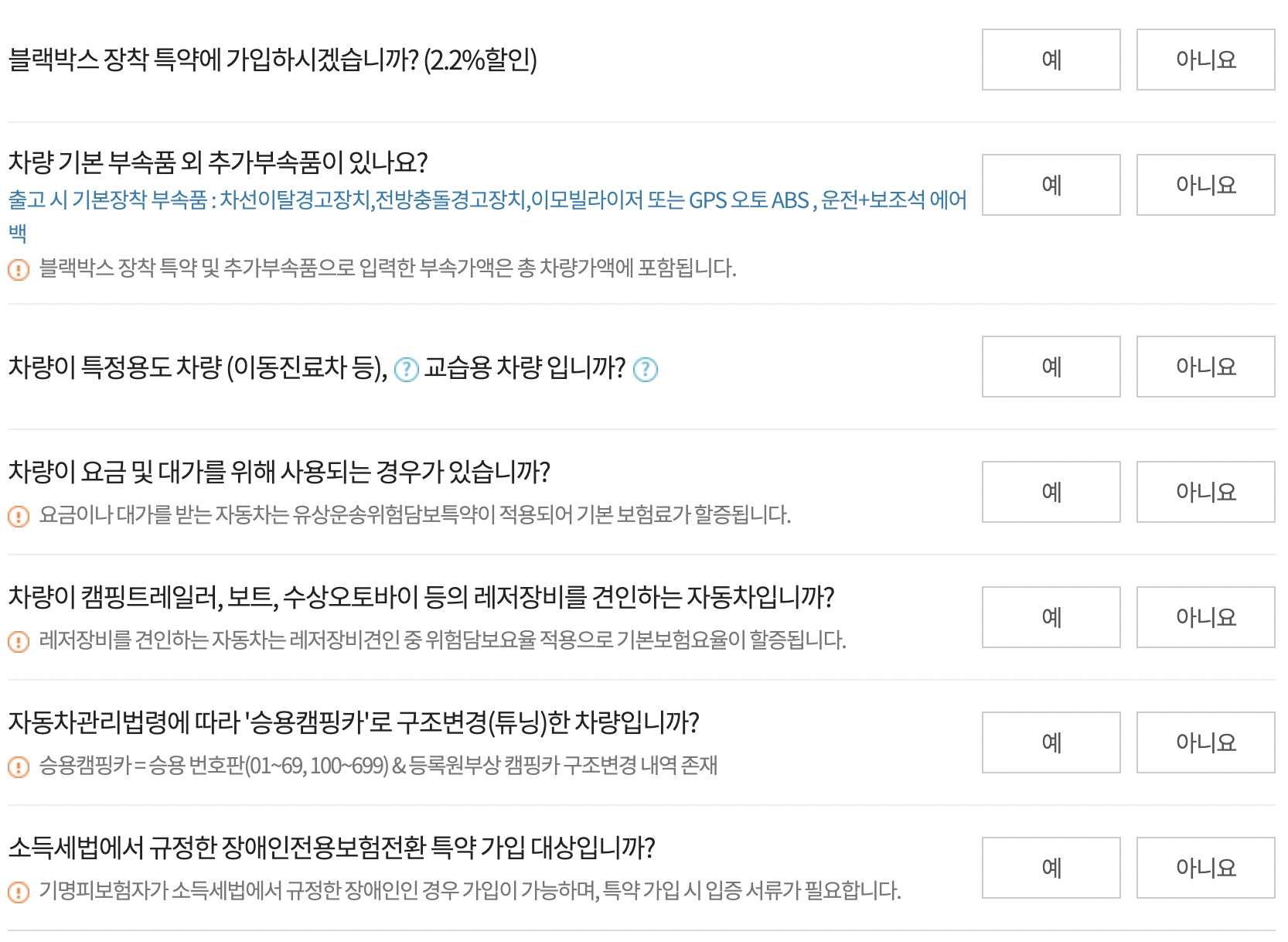 블랙박스를 장착했는지? 추가부속품은 달았는지? 차량용도는 무엇인지? 등을 본인의 차량에 맞게 선택 후 넘어가주도록 합니다.