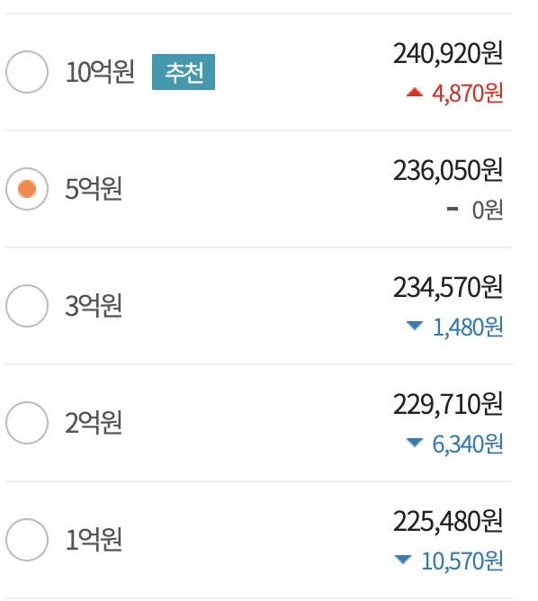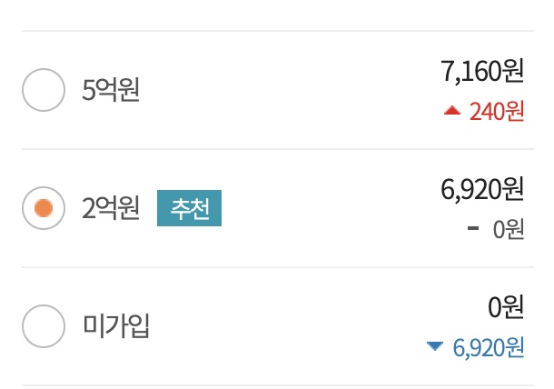 2억은 6,920원, 5억은 7,160원입니다. 최대 금액인 5억으로 가입하여도 대략 7천원정도의 금액밖에 추가되지 않기 때문에 5억으로 가입해주었습니다.