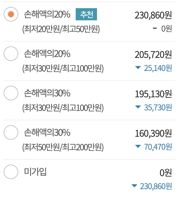 차량에 200만원의 수리비가 나왔다면, 200만원에서 자기부담금을 제외한 금액을 보상받을 수 있습니다. 자기부담금 비율을 선택할 수 있는데요, 저는 자기부담금을 가장 적게내는 20% 최저20만원, 최고50만원을 선택하여 가입했습니다.