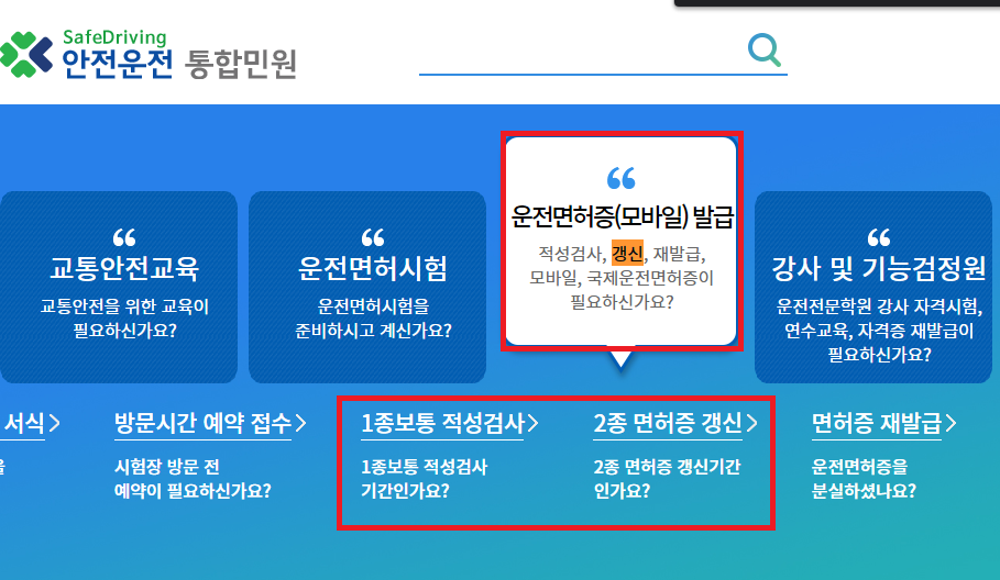 인터넷으로 운전면허증을 갱신신청하는 방법으로는 우선 이 링크에 접속하여줍니다. 운전면허증 발급을 클릭하여 1종보통 혹은 2종 면허증 갱신 자신에게 맞는것을 클릭해줍니다.