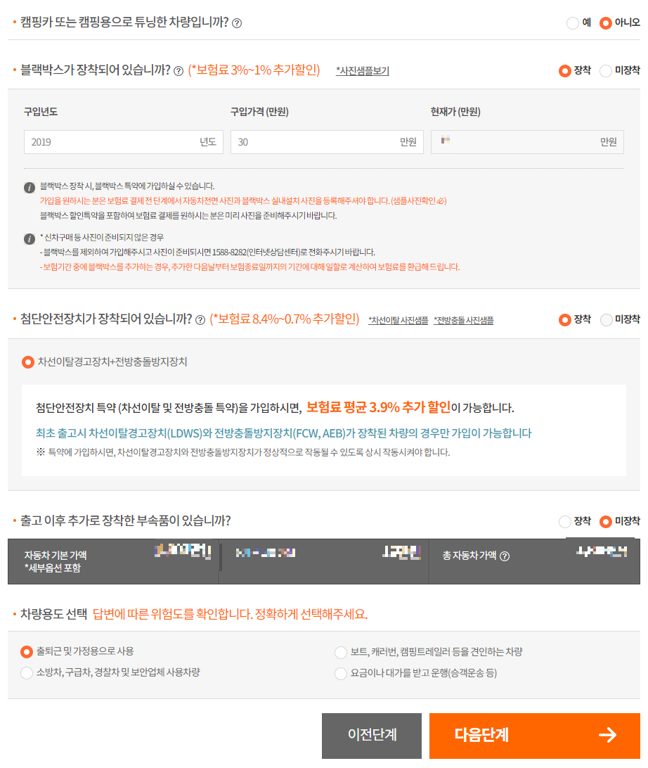 블랙박스가 장착되어있는지, 캠핑카로 튜닝한 차량인지, 첨단안전장치가 장착되어있는지 확인 후 체크한 다음 넘어가주도록 합니다.