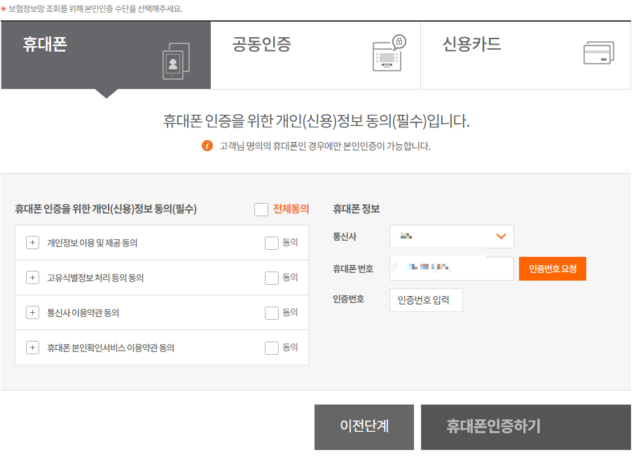 휴대폰 혹은 인증서 또는 신용카드로 본인인증을 완료해주도록 합니다.